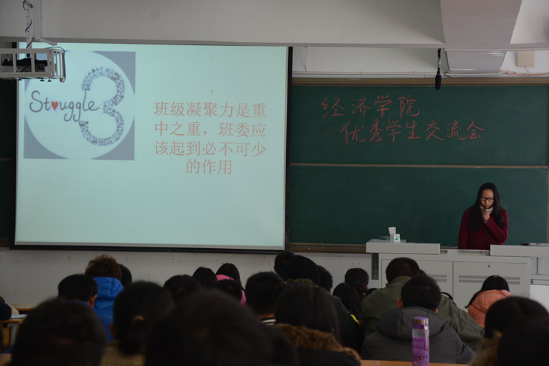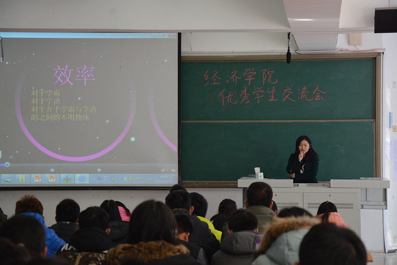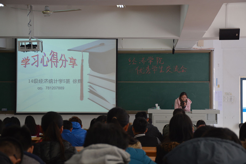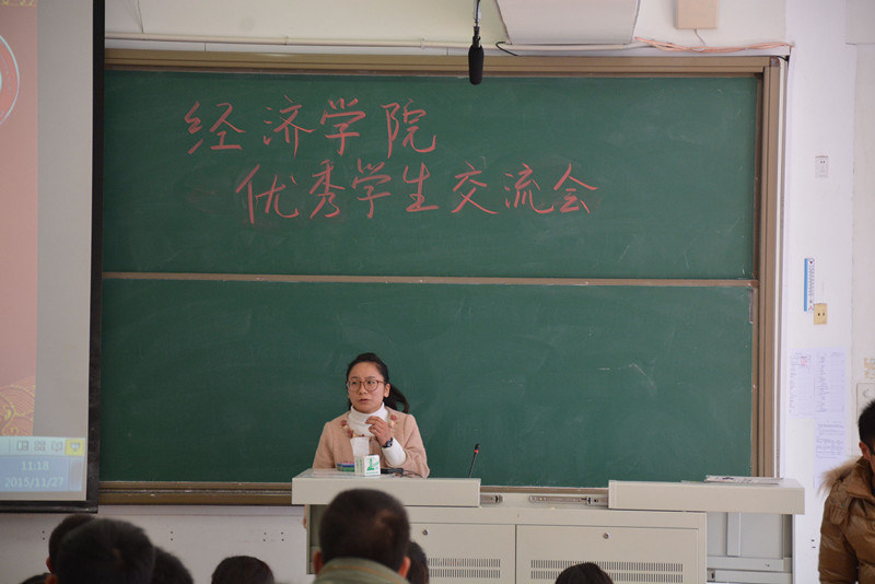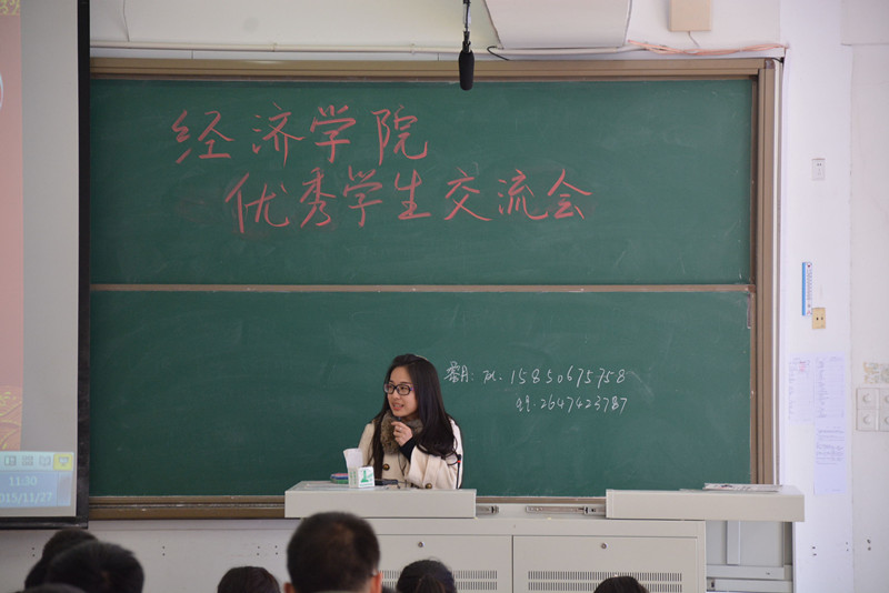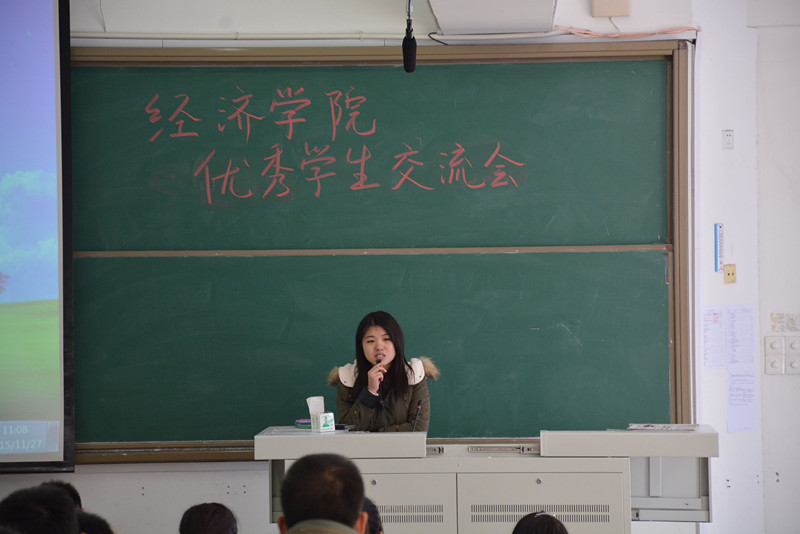 2014级国际经济与贸易3班的团支书诸韵雯就如何增强班级凝聚力做了详细的介绍与活动展示。她将班级建设划分为班委建设,学风建设,文化建设三部分详细为新生解说,重点指出班委建设,她强调了班委的重要性,指出举办班级活动为增添班级凝聚力起到的有效作用。作为获得优秀团支书荣誉的她,真心希望2015级新生能够超越他们。接着是2014级徐辉同学,她从学习的共性与针对性两方面为2015级新生分享学习心得。对于学习上的共性她指出,不管什么类型的学生都需要从态度端正,坚持自我,自制力强三个方面做好。她还为新生介绍了高数、Java的针对性学习。第三位发言的是2012级朱健乐同学,她首先提出目标的重要性,她提出“四年初,你想要的;四年末,你完成的”这么一个对比关系。之后又针对关于英语技能,关于办公技能,关于出国,关于保研,关于工作,关于考研做了详细的阐述。并将她的座右铭“放荡不羁的流浪,生生不息的信仰”送给大家。