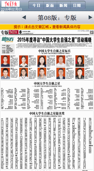 《中国青年报》(2016年02月03日08版)刊登报道,必赢76net线路官网必赢76net线路官网王海飞同学荣获2015年度“中国大学生自强之星提名奖”以及“中国大学生新东方自强奖学金”,我校仅王海飞同学1人入选。