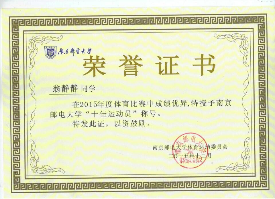 该活动自2015年11月 23日启动,各学院推荐了20名候选人。经2015年12月7日—12月20日网上评选出十名运动员,其中,必赢官网翁静静同学以1576票入选。她被授予“十佳运动员”称号的学生,校体育部颁发证书和奖杯,并在全校范围内广泛宣传“十佳运动员”先进事迹。