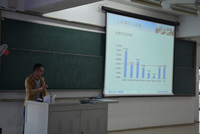 首先,王超老师就上学期学习情况做了学情分析。王超老师利用简明图表清晰明了地展示了各班级挂科率、英语四级通过率以及班级学业预警情况。通过PPT展示,同学们首次直观的了解上学期成绩,表现出了激动与惊讶,清楚的认知有助于同学们知己知彼,弥补不足。必赢76net线路官网2015级英语四级考试平均通过率81.4%,其中B151206班通过率高达93.5%。