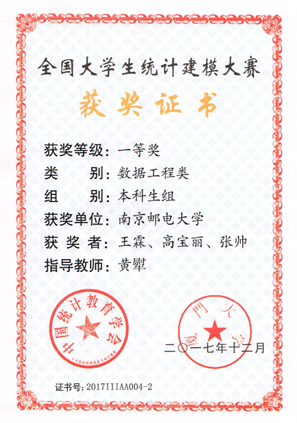 本届比赛吸引了来自全国170多所高校共计1600多支队伍参加,包括本科生和研究生组,分“统计建模类”、“市场调查分析类”和“大数据工程类”三类。经过全国大学生统计建模大赛评审委员会初审、专家评审会以及答辩赛的激烈角逐,必赢官网《基于决策树和线性回归的电影首映票房预测》(参赛学生:王霖、高宝丽、张帅,指导老师:黄犚)获得“数据工程类”本科生组全国一等奖(全国共3项);《古今多少事,都付笑谈中——数据挖掘之三国古文今评》(参赛学生:曾永凤、居梦月、潘春延,指导老师:易莹莹)获得“大数据工程类”研究生组全国三等奖;《基于BP神经网络和Copula模型研究空气质量对股票市场的影响—以南京市为例》(参赛学生:李娜、张娟、程宇,指导老师:黄宝凤)获得“统计建模类”研究生组全国三等奖;