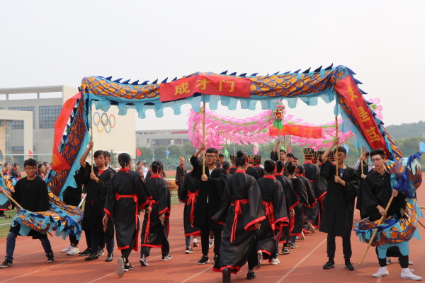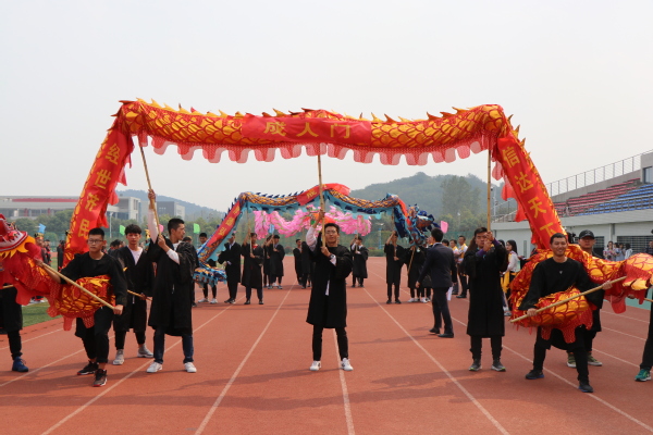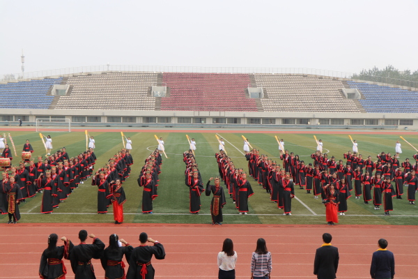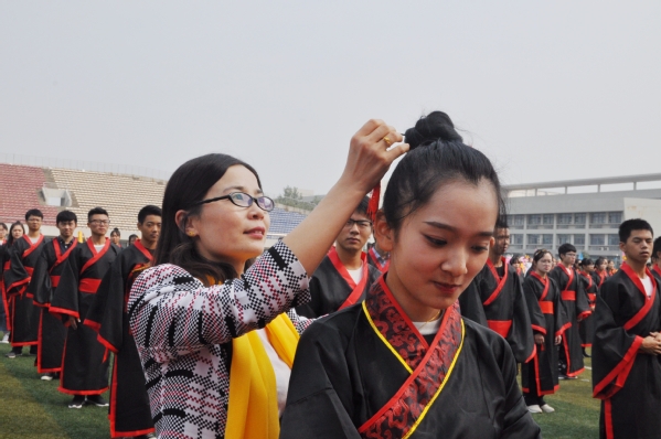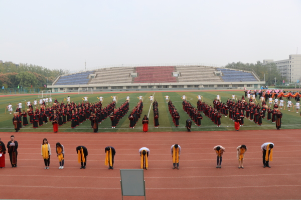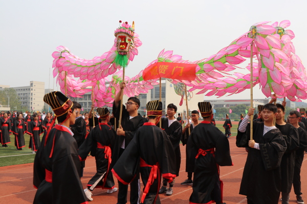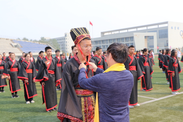 最后,全体学生身着汉服头戴冠簪依次通过成人门(经世济民、信达天下),成才门(厚德弘毅、求是笃行)和成贤门(谦谦君子、家国情怀)。寓意同学们能够做到:院训谆谆萦耳畔,大气有为不退避;铮铮校训刻心间,与时俱进踏实地;永葆胸中家国情,艰苦奋斗创先锋。