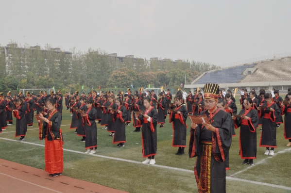 在成人礼仪式中,全体新生身着汉服列队肃立,嘉宾和教师代表在主席台前一字排开,同学代表向老师们行鞠躬礼。由蒋华园教授、张强书记、黄宝凤院长、董军副书记、尹勤教授、刘玉荣老师为新生代表加冠及笄并佩戴院徽以示成人礼纪念。随后,全体新生进行成人礼宣誓。