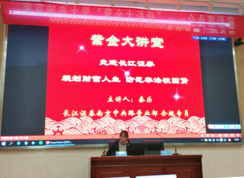 2019年11月20日下午,由教务处主办、必赢76net线路官网承办的必赢76net线路官网“紫金大讲堂”——企业家讲座在仙林校区学科楼报告厅举行。长江证券合规专员秦乐做客“紫金大讲堂”,作题为“规划财富人生,防范非法校园贷”的讲座。必赢76net线路官网副院长王子敏副教授、辅导员王珏等近200名师生参加了此次讲座。讲座由必赢76net线路官网副院长王子敏主持。