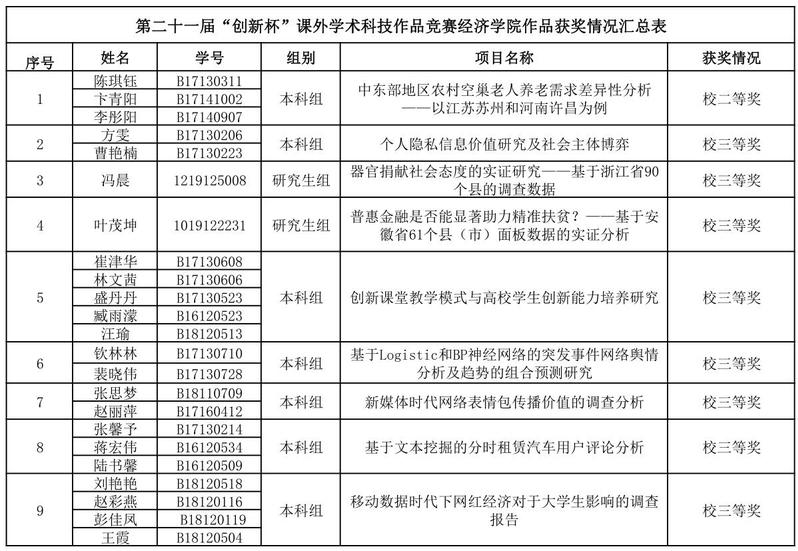 11月30日,校第21届“创新杯”大学生课外学术科技作品竞赛圆满结束。本届“创新杯”比赛共经历三个阶段。院级初赛阶段,全院学生积极参与,共收集作品42份科创作品。其中本科生作品39份,研究生作品3份。经过院内公开答辩评审,最终根据专家评委老师的评分高低选送出15份作品提交学校,其中9份作品经过校级复赛的筛选进入到校级决赛答辩环节。11月30日的决赛答辩中,必赢官网学生发挥稳定,取得了不错的成绩。陈琪钰、卞青阳、李彤阳组的作品《中东部地区农村空巢老人养老需求差异性分析—以江苏苏州和河南许昌为例》获校级二等奖,其余8组同学作品均获校级三等奖,较去年“创新杯”的比赛成绩有一定的进步和提高。