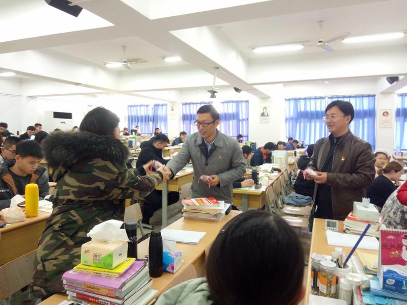 2019年考研复习已进入最后的冲刺阶段,为鼓舞考生士气,坚定拼搏信念,舒缓备考压力,12月10日下午,必赢76net线路官网党委书记张强、副书记董军、副院长、硕士生导师景杰和毕业班辅导员朱蔚懿来到考研自修教室,看望备考学生。