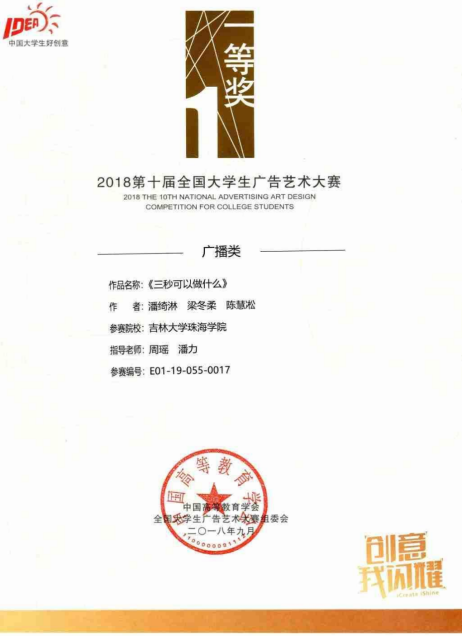 在第十届全国大学生广告艺术大赛中,文学院推送的作品《三秒可以做什么》获得大赛广播类作品全国一等奖,这是文学院首次在全国大学生广告艺术大赛中获得国家级一等奖,实现了突破。作品《善言善语》获得大赛视频类作品全国二等奖,作品《华潮来袭》获得大赛广播类作品全国三等奖。此外还获得大赛优秀奖10项,广告学专业教师周瑶被评为大赛优秀指导教师,全国仅有40名教师获此殊荣。