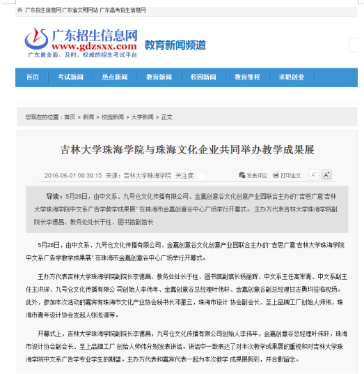 2016年,“吉思广意”文学院广告学教学成果展在珠海市金嘉创意谷顺利举行,这是吉林大学珠海学院首次在校外举办专业作品展,社会媒体普遍给予关注和报道。