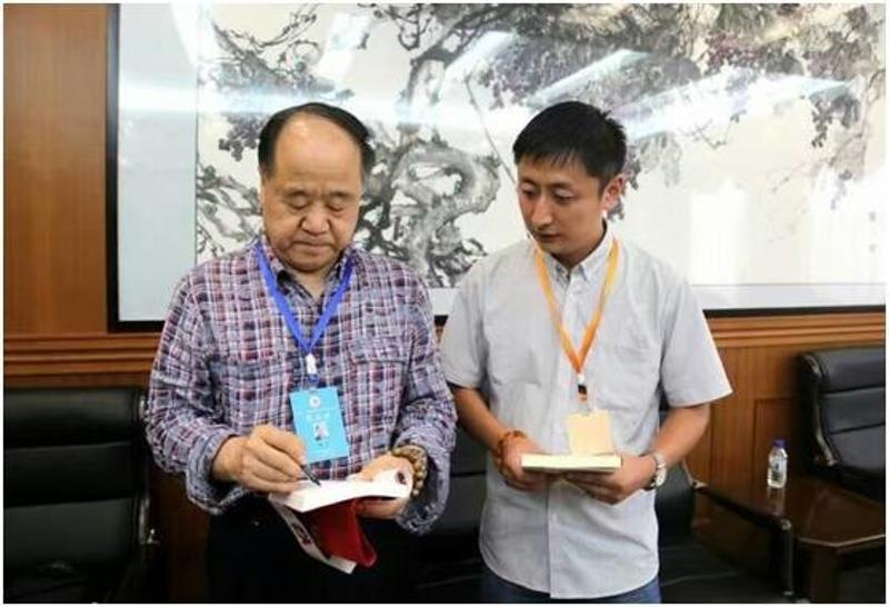 著名作家莫言(左)为汉语言文学专业毕业生马犇(右)题签