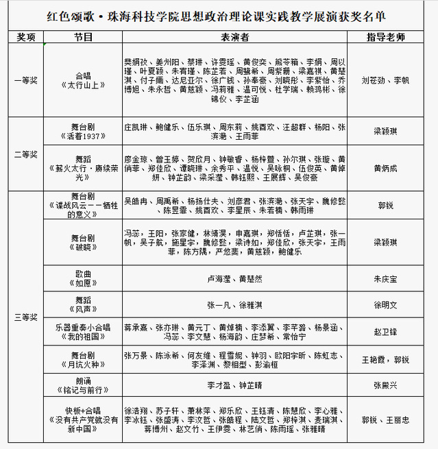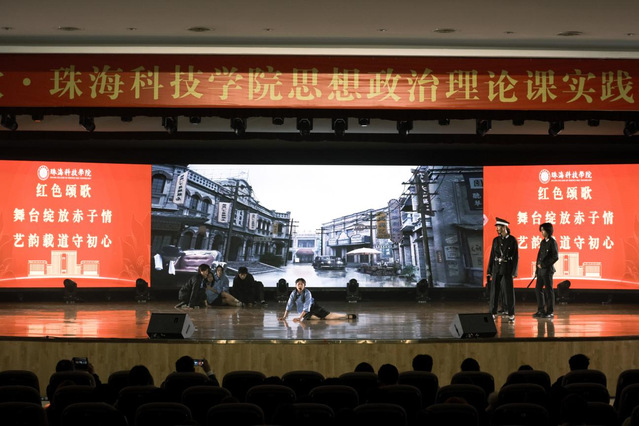 本次实践教学展演活动从学期初开始筹备,期间,来自各学院40支队伍经过初赛、复赛两轮激烈角逐,最终12支队伍脱颖而出晋级决赛。决赛展演内容丰富、形式多样,各参赛队伍结合主题,以精湛的表演打动了现场每一位观众。展演以朗诵《穿越时空的回眸》开篇,身着白衣的少年们在朗朗吟诵中带领观众穿越时空,回到80年前中华民族抗击侵略的峥嵘岁月,重温抗战英雄守护家园、捍卫和平的英勇事迹;快板与合唱结合的《没有共产党就没有新中国》,用清脆的竹板声和激昂的歌声,传递出对党的衷心拥护与对祖国的无限热爱;合唱《在太行山上》再现了战火纷飞年代里军民同心、奋勇抗敌的壮志豪情;舞蹈《风声》以优美的肢体语言,生动演绎了情报战线上革命者的忠诚与信仰;舞台剧《谍战风云 —— 牺牲的意义》《活着 1937》《月坑火种》分别从不同视角展现了革命先辈为民族解放不惜牺牲的崇高精神,其中《月坑火种》更是以珠海斗门本地红色记忆为蓝本,让观众深刻了解到家乡的抗战历史;舞蹈《薪火太行・赓续荣光》、朗诵《铭记与前行》进一步激发了现场师生的爱国情怀与历史责任感;乐器重奏小合唱《我的祖国》、歌曲《如愿》则用悠扬的旋律与真挚的情感,传承红色精神,传递新时代青年的使命担当。